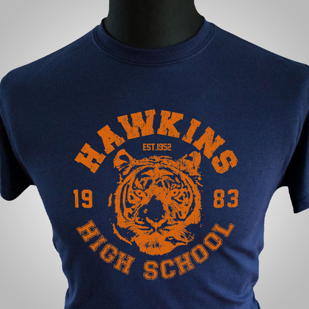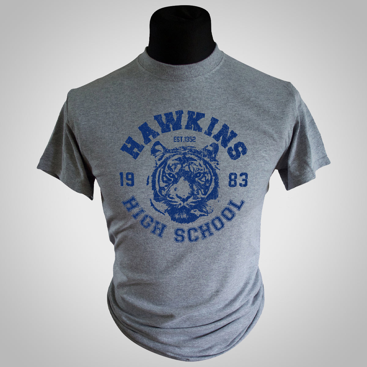 A single colour distressed screen print on to a either a sport grey or navy blue coloured shirt